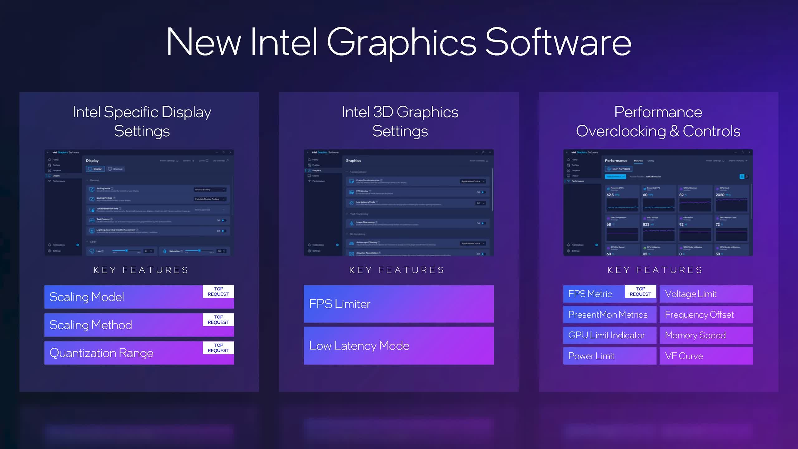 Alte caracteristici software pe care Intel le lansează împreună cu Battlemage includ un utilitar Intel Graphics Software revizuit. Acest utilitar actualizat include funcții solicitate frecvent, cum ar fi o valoare FPS în setările de suprapunere și de scalare a afișajului.