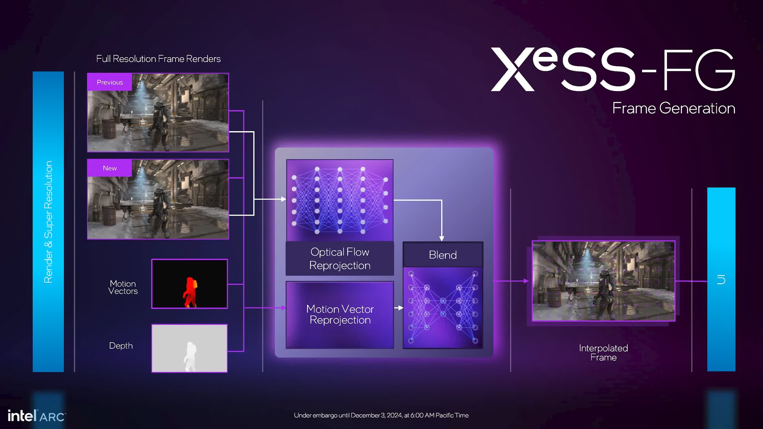 Acest lucru se realizează prin reproiectarea fluxului optic, împreună cu reproiectarea vectorului de mișcare și alte intrări. Intel spune că XeSS 2 are două modele AI: modelul de flux optic și un model de amestec care combină ieșirile generate prin fluxul optic și reproiecția vectorului de mișcare. Interfața de utilizare este compusă pe fiecare cadru la sfârșit.