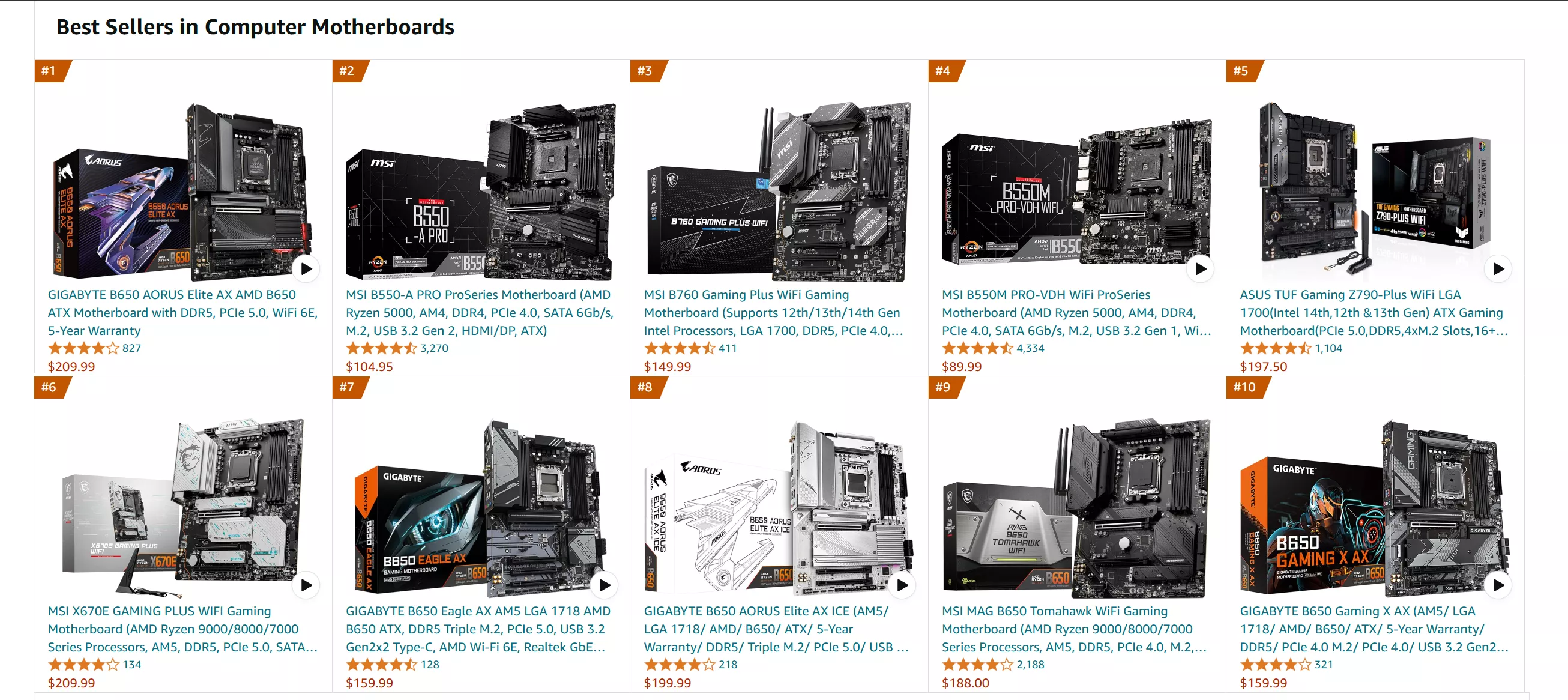 Nu doar în Germania domină AMD. Opt dintre primele zece plăci de bază cele mai vândute pe Amazon sunt mobo-uri AMD, inclusiv primele două cele mai bine vândute.