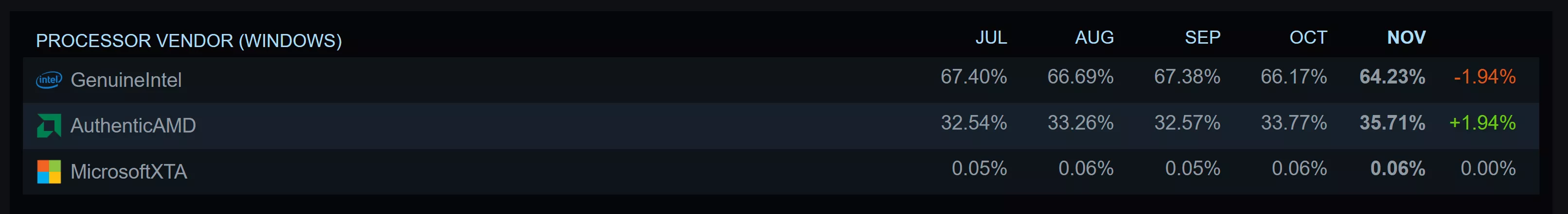 Tariful AMD este reflectat în cel mai recent sondaj Steam. Ponderea CPU a companiei în rândul participanților la sondajul Valve a atins un nivel record de 35,7%, deoarece reduce decalajul față de Intel cu fiecare lună care trece.