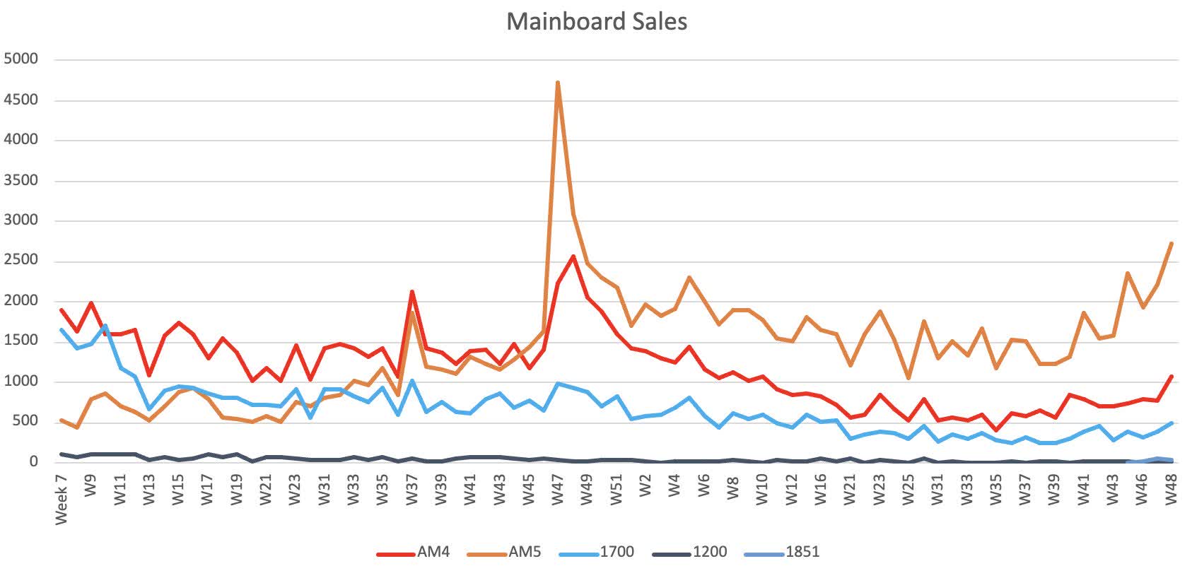 Defalcând tipurile de prize individuale, AM5 de la AMD a fost cel mai popular cu 2.730 de vânzări. A fost urmată de priza AM4 cu 1.070 de vânzări.