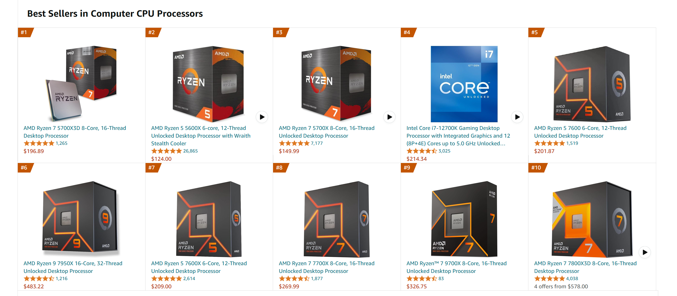 Nu este surprinzător că primele zece procesoare cele mai vândute de la Amazon prezintă o imagine similară: doar unul este de la Intel – locul al patrulea Core i7-12700K.