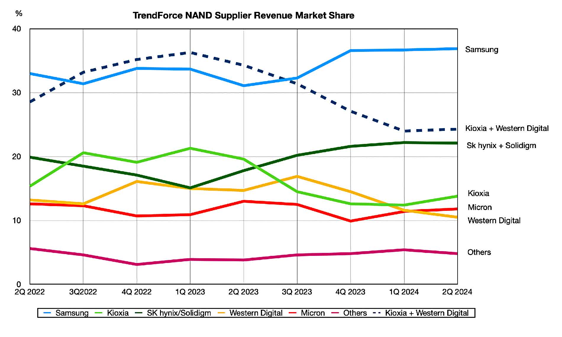 Samsung deține în prezent o cotă de piață de 37%, dar menținerea acestei poziții devine din ce în ce mai dificilă, deoarece concurenți precum Micron, YMTC, SK Hynix și Kioxia își accelerează dezvoltarea 3D NAND cu densitate mai mare.