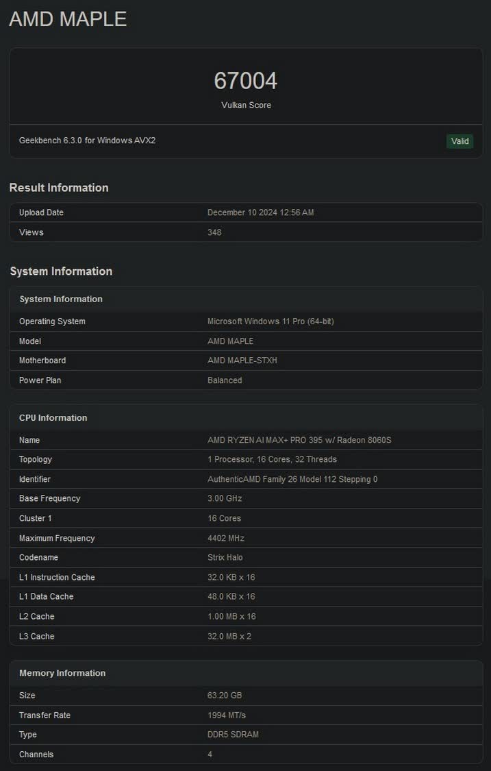 Trecând la rezultatele de referință, Ryzen AI Max+ Pro 395 a obținut 67.004 de puncte la testul Vulkan API, ceea ce este mai mare decât cele 63.264 de puncte înregistrate de GPU-ul mobil Nvidia GeForce RTX 4060. Cu toate acestea, deoarece acesta este doar scorul inițial de referință, ne putem aștepta ca acesta să devină și mai rapid după câteva actualizări de drivere și firmware.