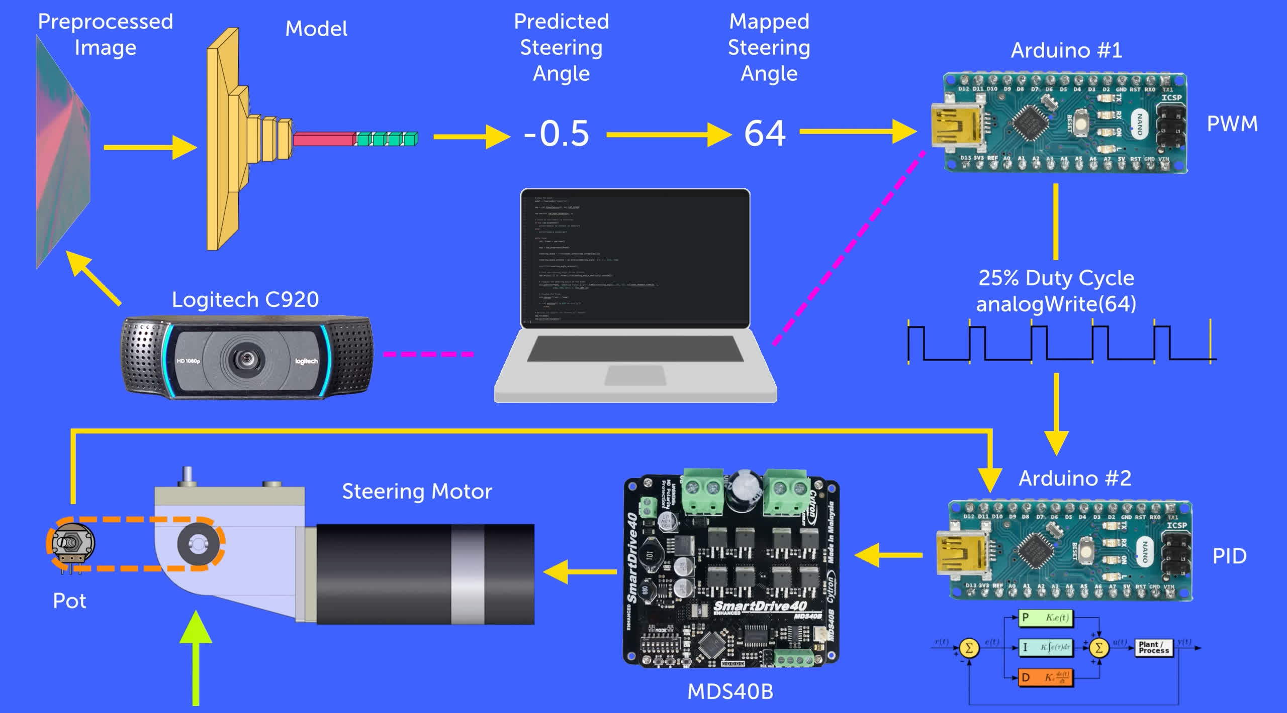 Totuși, a fost nevoie de un total de trei Arduinos. Unul a transmis predicțiile de direcție de la computer către al doilea Arduino, care a combinat aceste date cu feedback-ul pozițional pentru a acționa un motor care controlează unghiul de direcție. Al treilea Arduino a manevrat clapeta de accelerație furnizând semnale de control controlerului de viteză al kartului.