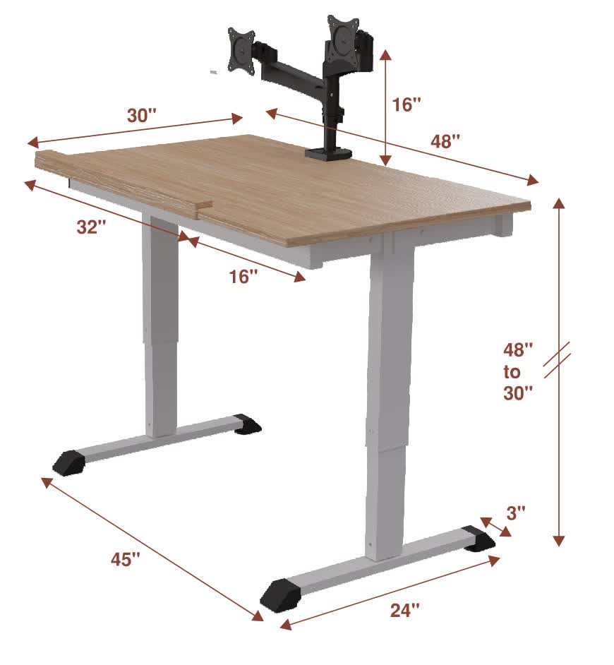Biroul Ergo măsoară 48 inchi pe 30 inci, cu reglarea înălțimii variind de la 30 inchi la 48 inci, așa că ar trebui să fie confortabil de utilizat în poziția sa în picioare pentru oricine între 6′ 6″ și 4′ 8″.