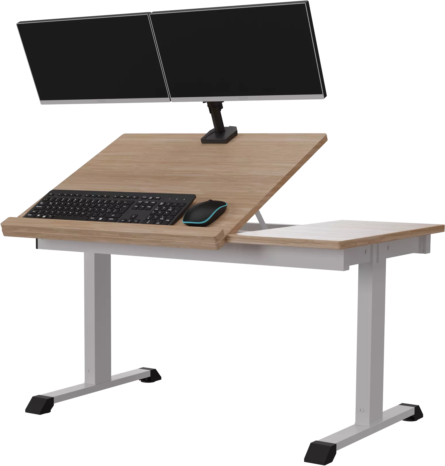 Produsul companiei canadiane Ergo Desk poate fi folosit atat ca birou de sezut cat si ca birou in picioare, dar are si o alta caracteristica: suprafata poate fi inclinata pana la 45 de grade. Funcționalitatea înseamnă că puteți utiliza biroul confortabil chiar și atunci când scaunul este înclinat, ținând monitorul(e) direct în fața ochilor.