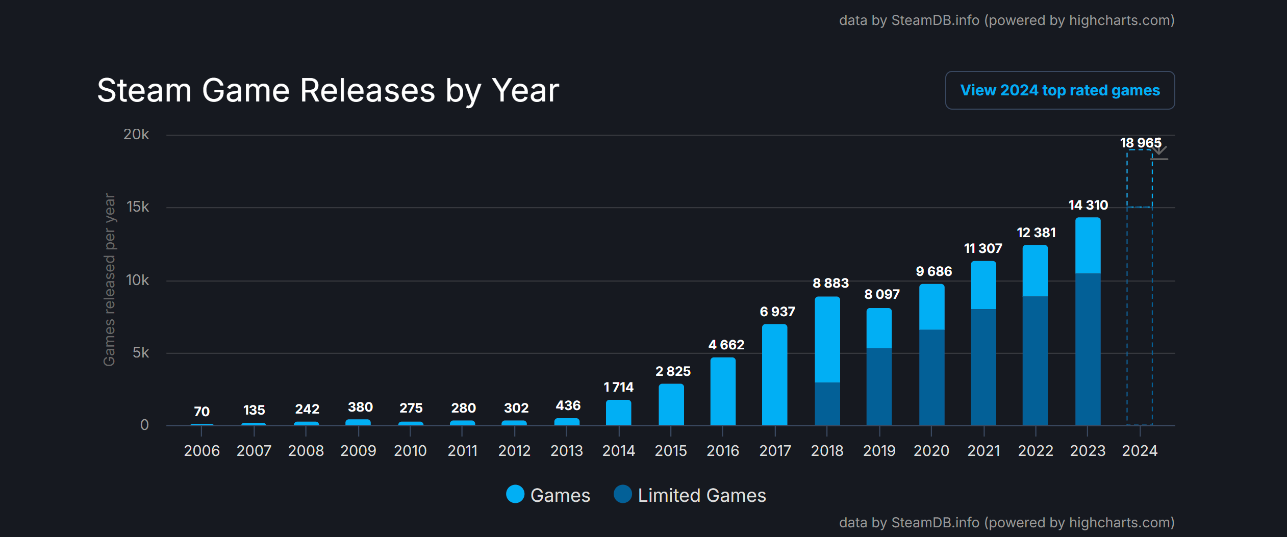 Cu doar patru ani în urmă, în 2020, au fost lansate 9.686 de jocuri noi de-a lungul anului pe Steam, aproximativ jumătate din numărul de lansări noi din 2024. Du-te până în 2006, la trei ani după ce Steam a sosit prima dată și doar 70 de jocuri au fost lansate. lansat pe serviciu în acel an.