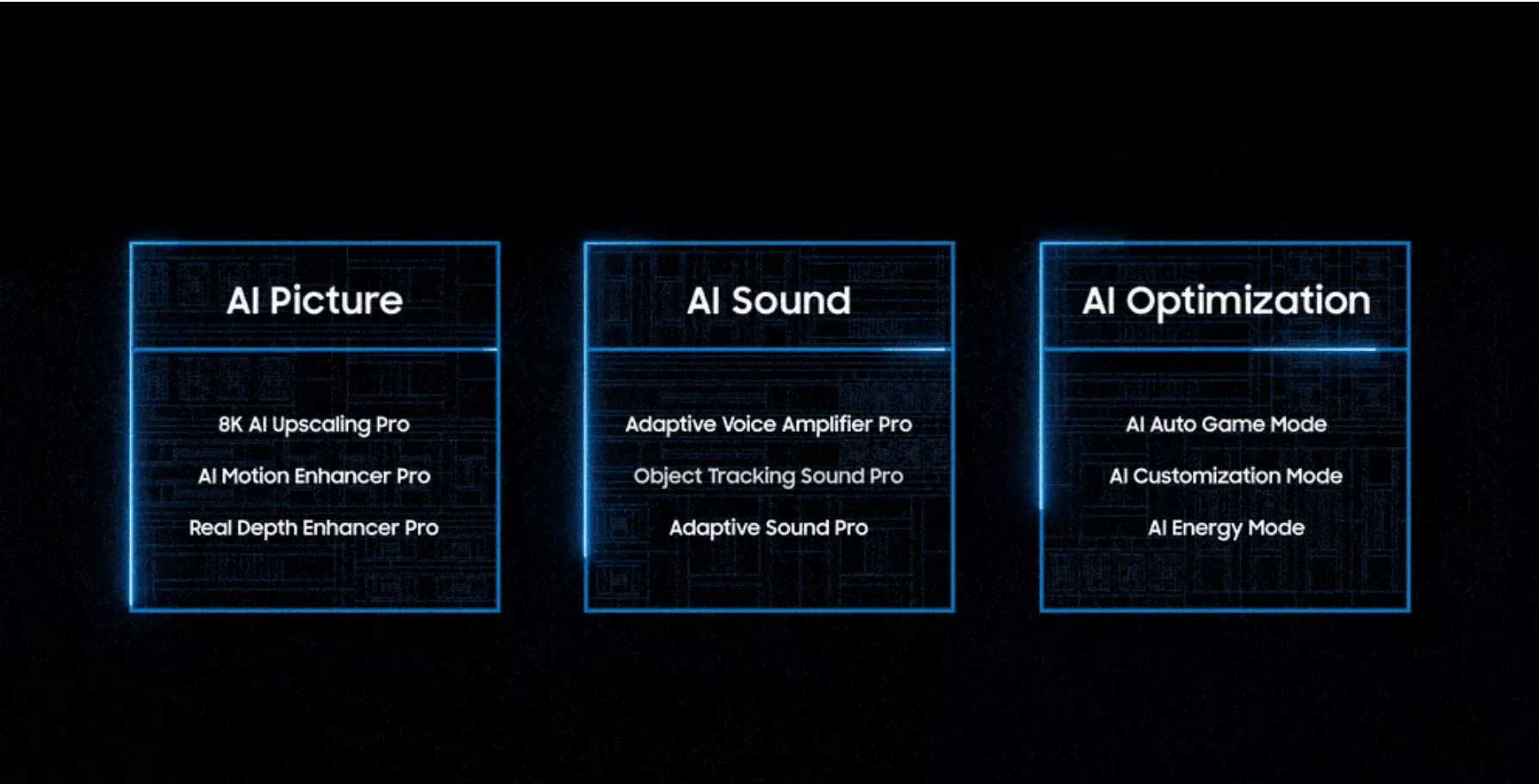 Samsung scrie că flagship-ul său Neo QLED 8K QN990F dispune de un procesor 8K NQ8 AI Gen3. Cipul are o unitate de procesare neuronală (NPU) care rulează de două ori mai repede decât predecesorul său, având de opt ori mai multe rețele neuronale – 512 în loc de 64.