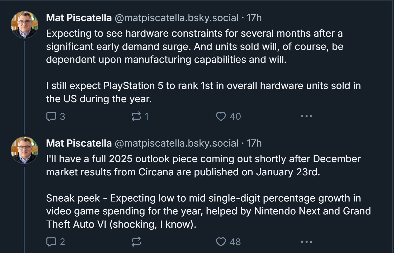 În timp ce 4,3 milioane de unități nu este un număr mic, Piscatella consideră că cea mai vândută consolă din 2025 va fi PlayStation 5. Aparatul Sony a ocupat fruntea atât în topurile vânzărilor de unități, cât și în dolari în ianuarie, februarie, aprilie, mai, septembrie și noiembrie 2024.