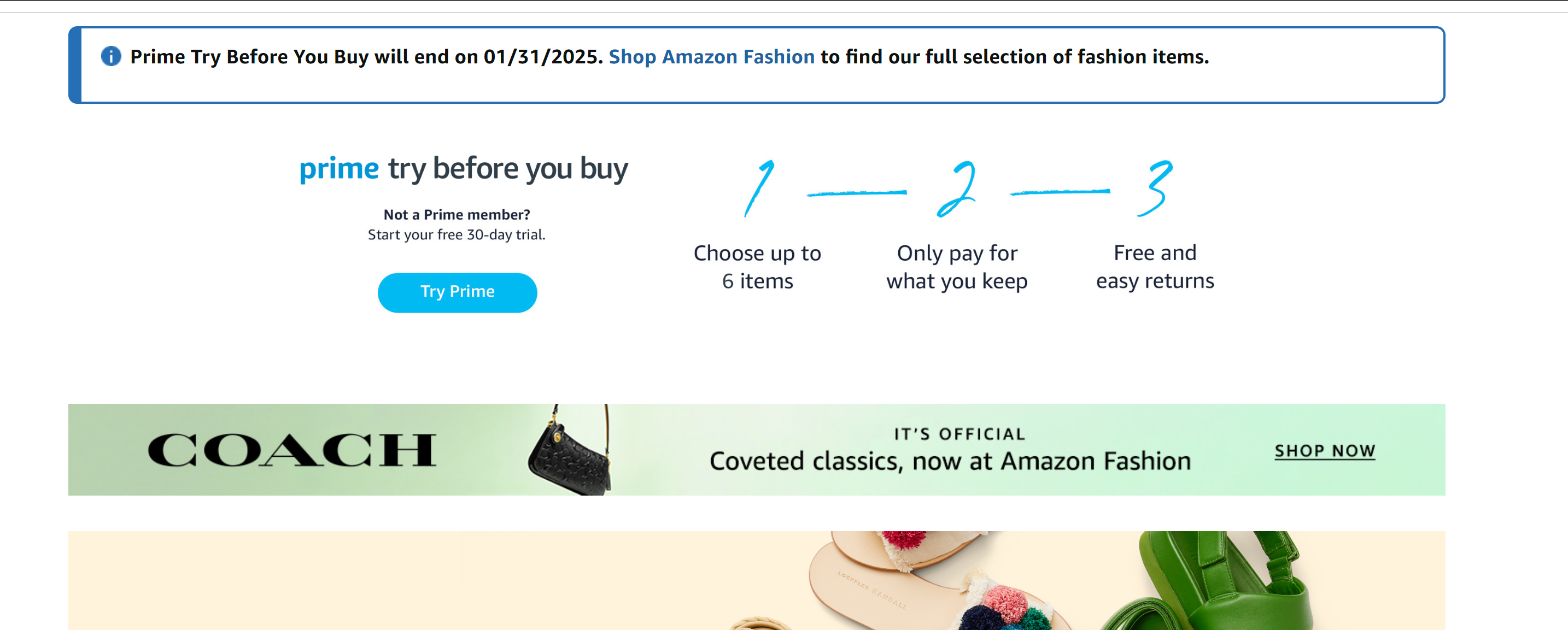 Pe 31 ianuarie, la aproximativ șapte ani de la sosire, Amazon va închide serviciul Try Before You Buy. Un purtător de cuvânt a spus că motivul închiderii se datorează parțial programului care include un număr limitat de articole. Ei au mai spus că funcțiile bazate pe inteligență artificială, cum ar fi încercarea virtuală – care folosește o cameră a smartphone-ului pentru a plasa redări virtuale ale pantofilor pe picioarele tale – recomandări de mărimi personalizate, evidențieri de revizuire și diagrame de mărimi îmbunătățite înseamnă să încerci articole vestimentare acasă înainte de a le cumpăra. este mai puțin important – din nou, asta este potrivit Amazon.