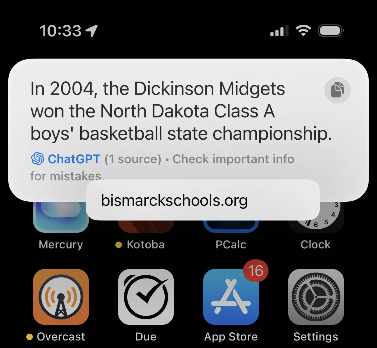 Performanța slabă a lui Siri nu se oprește nici la trivialități sportive. Daring Fireball a pus o întrebare mai obscure – „Cine a câștigat campionatul de baschet de stat al băieților din liceul din Dakota de Nord din 2004?” Incredibil, atât Kagi, cât și ChatGPT au oferit răspunsul complet corect, acesta din urmă câștigând puncte bonus pentru includerea unui link către videoclipul jocului de campionat. Între timp, Siri a greșit din nou.
