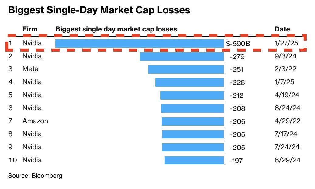Recordul pentru cea mai mare cădere a plafonului de piață anterior aparține și Nvidia. În septembrie 2024, datele slabe privind starea sectorului de producție de la Institutul pentru Managementul Ofertei au adus îngrijorări cu privire la o încetinire economică. Aceasta a dus la ștersul de 279 de miliarde de dolari din valoarea companiei, învingând meta -pierderea de 232 de miliarde de dolari suferită în februarie 2022.