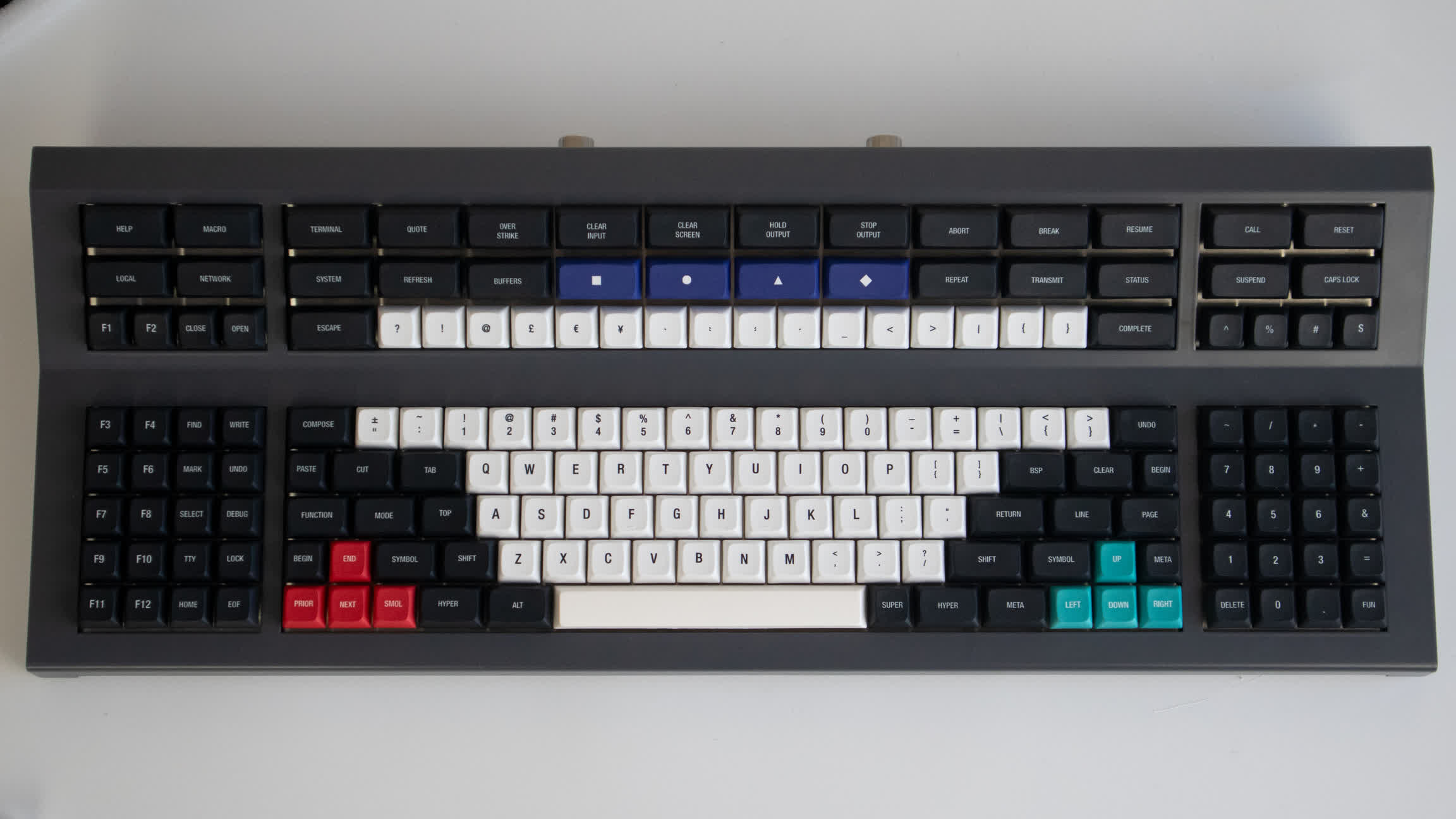 Placa are 178 de taste așezate în jumătate de duzină de blocuri separate, inclusiv o gamă uriașă de taste programabile în partea de sus, care sunt ridicate și înclinate într-un unghi de 45 de grade. Este oferit în alegerea ta de machete clasice sau moderne și patru culori: negru, gri, cremă sau oțel inoxidabil gol.