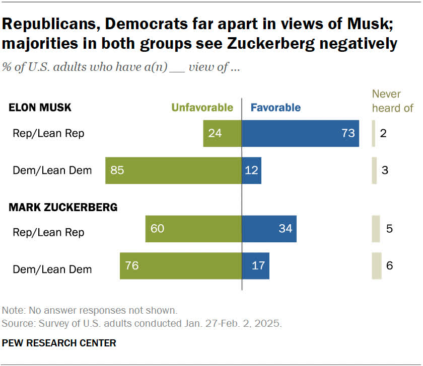 Pe scurt: Doi dintre cei mai influenți CEO -uri din lumea tehnologiei, Elon Musk și Mark Zuckerberg, s -au aliniat îndeaproape cu președintele Donald Trump recent, dar cum a afectat asta părerea națiunii asupra acestor miliardari? Potrivit unui nou sondaj, mai mulți oameni nu le place perechea decât le place. Cu toate acestea, în timp ce republicanii au o opinie mai favorabilă despre Musk, se pare că aproape toată lumea nu -i place Zuckerberg.