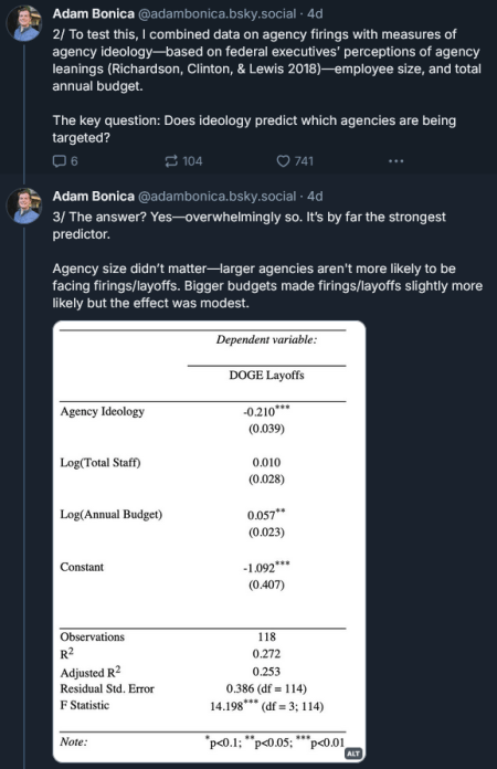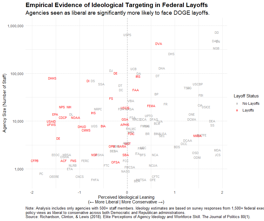 Acest post reproduce concluziile Dr. Bonica care sugerează o relație semnificativă între ideologia percepută de o agenție și probabilitatea sa de a se confrunta cu reduceri de forță de muncă mandatată de Doge. Cel mai recent set de date este disponibil aici pentru cei interesați să efectueze analize suplimentare.
