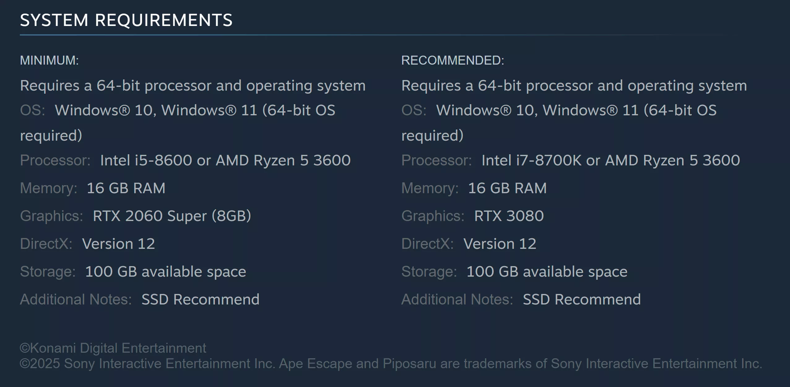 Metal Gear Solid Delta: Snake Eater necesită cel puțin un Nvidia RTX 2060 Super cu 8 GB de VRAM, 16 GB de memorie de sistem și 100 GB spațiu de stocare. Jocul recomandă, de asemenea, un 3080, dar Konami nu specifică rezoluțiile țintă sau ratele de cadru. În timp ce un Super 2060 nu este solicitat de majoritatea standardelor, omisiunea GPU-urilor de înaltă calitate GTX 10 și toate cardurile AMD ridică întrebări despre motivul pentru care seria RTX 20 este specificația minimă.