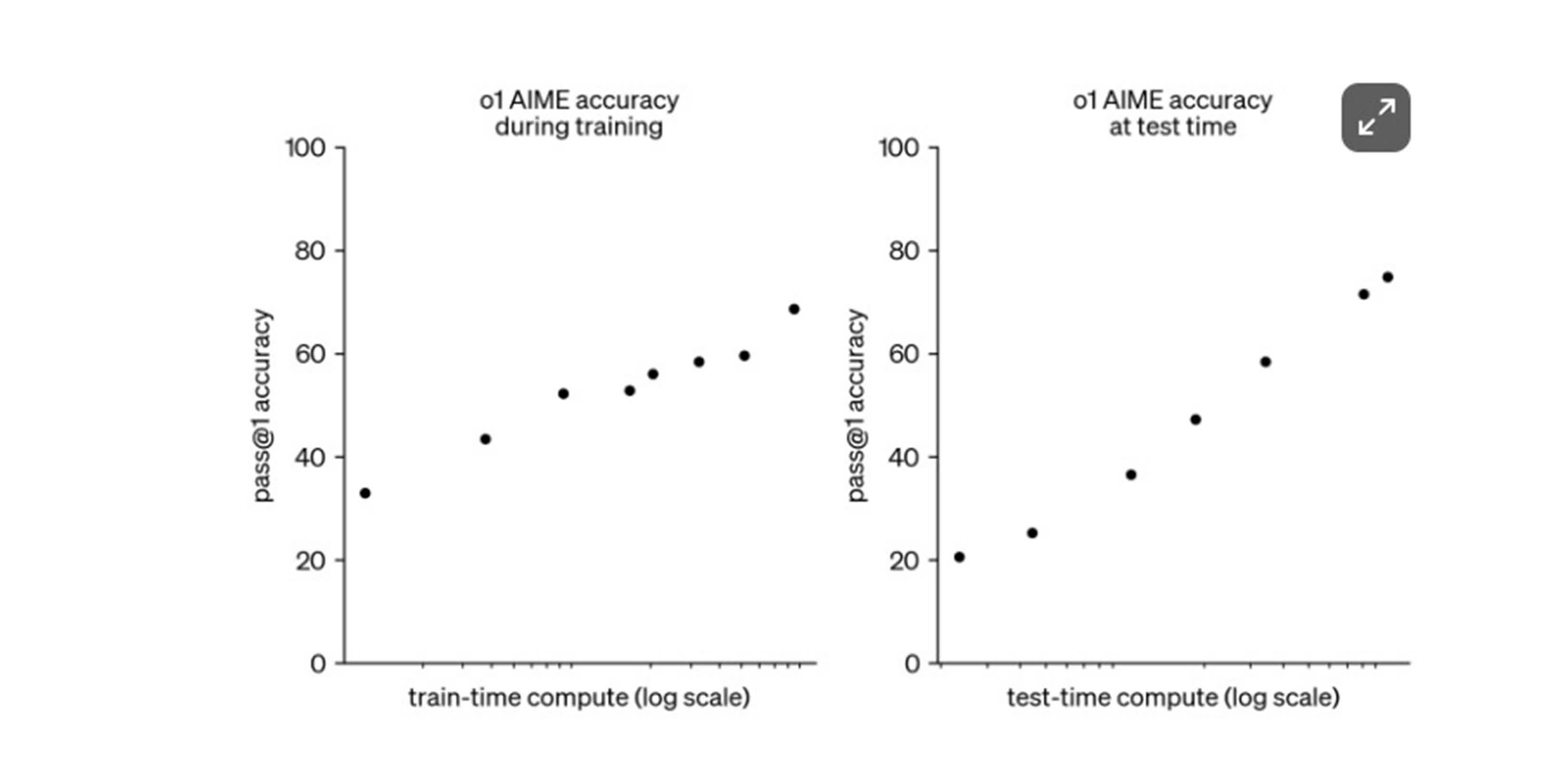 A doua lege de scalare, reprezentată pe partea dreaptă a graficului, dezvăluie un fenomen intrigant: performanța AI poate fi îmbunătățită, permițând modelului mai mult timp pentru procesarea informațiilor în timpul rezolvării problemelor.