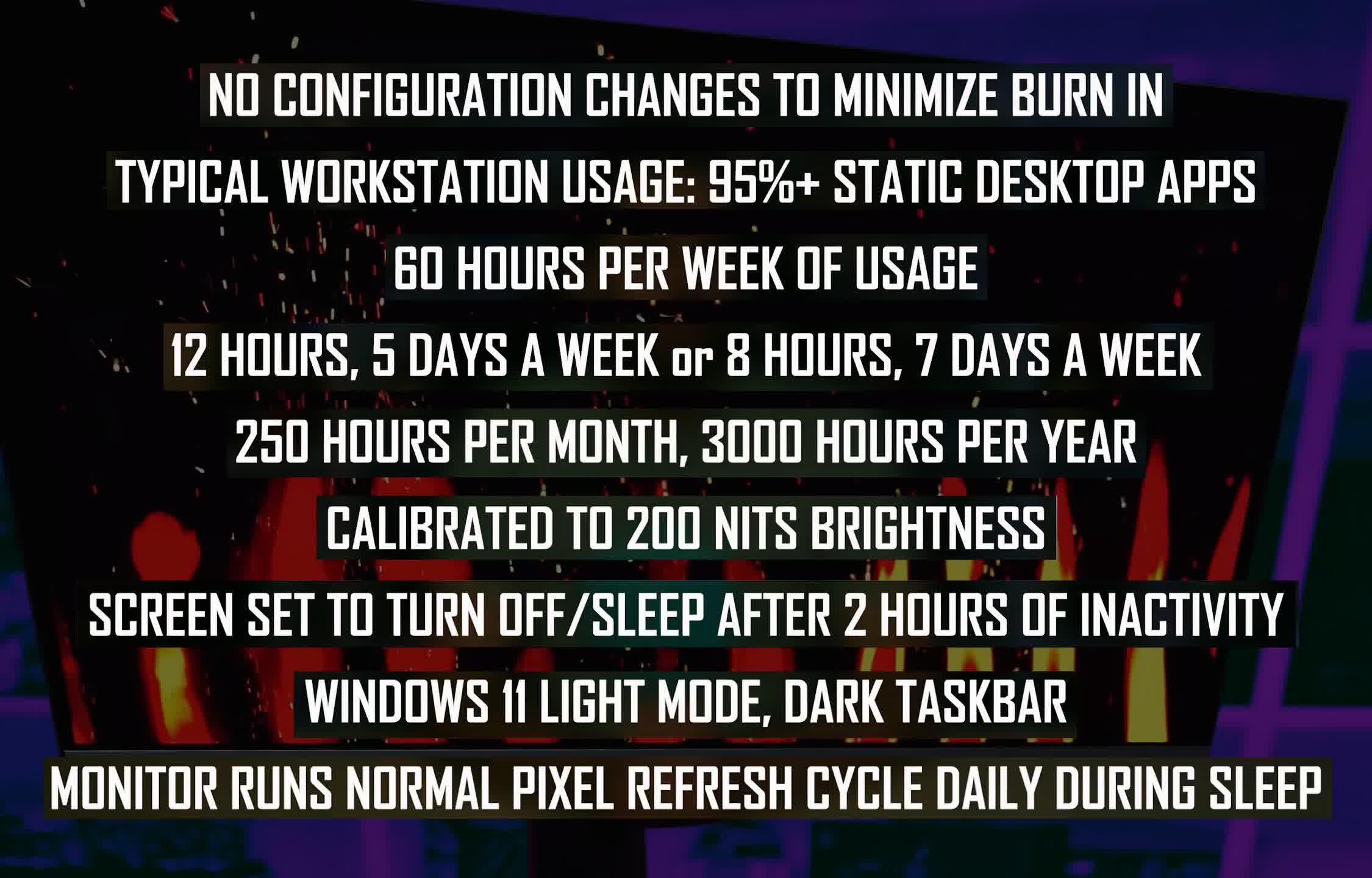 Îmi folosesc monitorul mai mult de 8 ore pe zi și, uneori, utilizarea este continuă, fără pauze pentru ca afișajul să se oprească și să se odihnească. Acest lucru duce la ore întregi de utilizare statică – ceva care a fost perfect bine pentru LCD -uri de mult timp, dar este destul de riscant pe ecranele OLED mai noi.