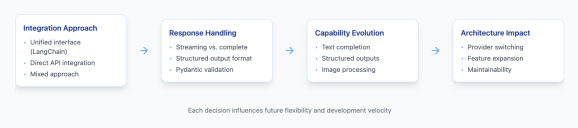 Am văzut că proiectele încep cu o simplă completare a textului, să crească pentru a include ieșiri structurate și, în cele din urmă, gestionăm procesarea imaginilor. Fiecare iterație a adus noi decizii tehnice: utilizați o interfață LLM unificată precum Langchain sau lucrați direct cu API -urile OpenAI și Claude? Răspunsuri de streaming sau non-streaming?