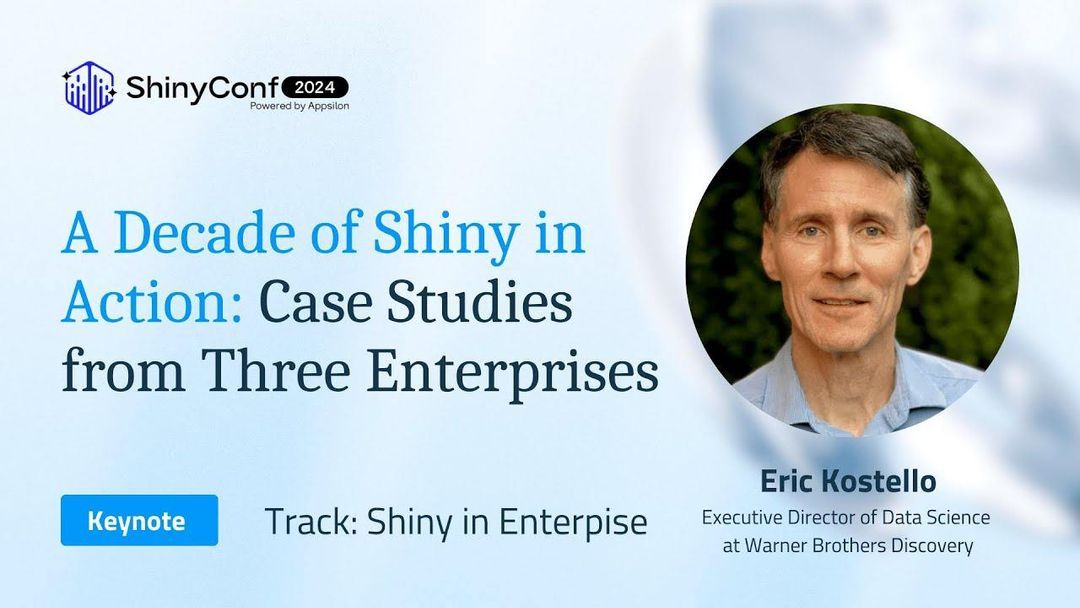 Livrarea Keynote ShinyConf 24 pentru piesa strălucitoare în Enterprise, Eric Kostello, directorul executiv al științei datelor la Warner Brothers Discovery, a discutat despre rolul instrumental Shiny, iar evoluția sa a jucat în proiecte în care a fost implicat în ultimul deceniu.