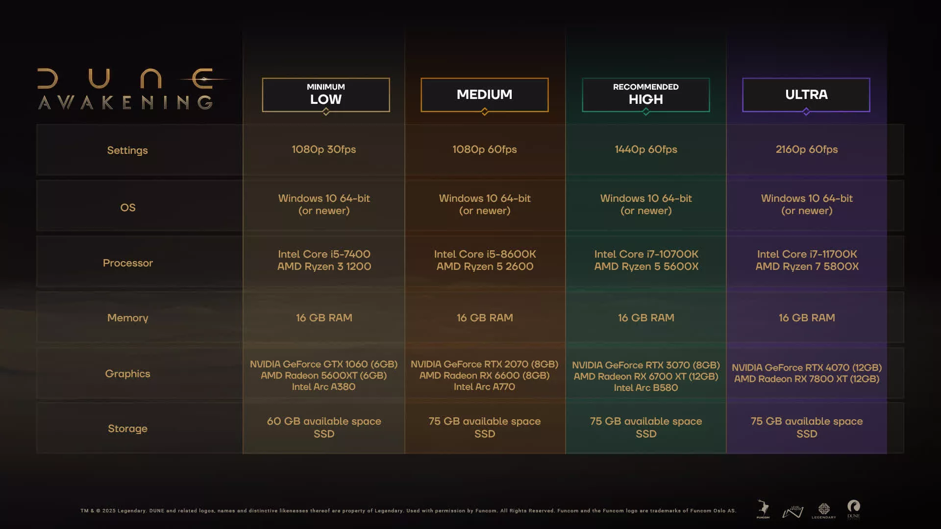 Funcom nu a menționat dacă recomandările reprezintă o performanță, dar Dune: Awakening va suporta DLSS 4 mai multe cadre, FSR și Xess 2. Cu toate acestea, dezvoltatorul nu a specificat dacă jocul acceptă FSR 4, ceea ce oferă cea mai bună calitate a imaginii de la RX 9000 GPU-uri lansate recent de AMD. Jucătorii interesați pot testa Dune: performanța Awakening folosind creatorul de personaje gratuite și instrumentele de referință. Cei obosiți de 100 și 150 GB jocuri vor fi, de asemenea, încântați să descopere că MMO va avea nevoie doar de 60 și 75 GB la lansare.