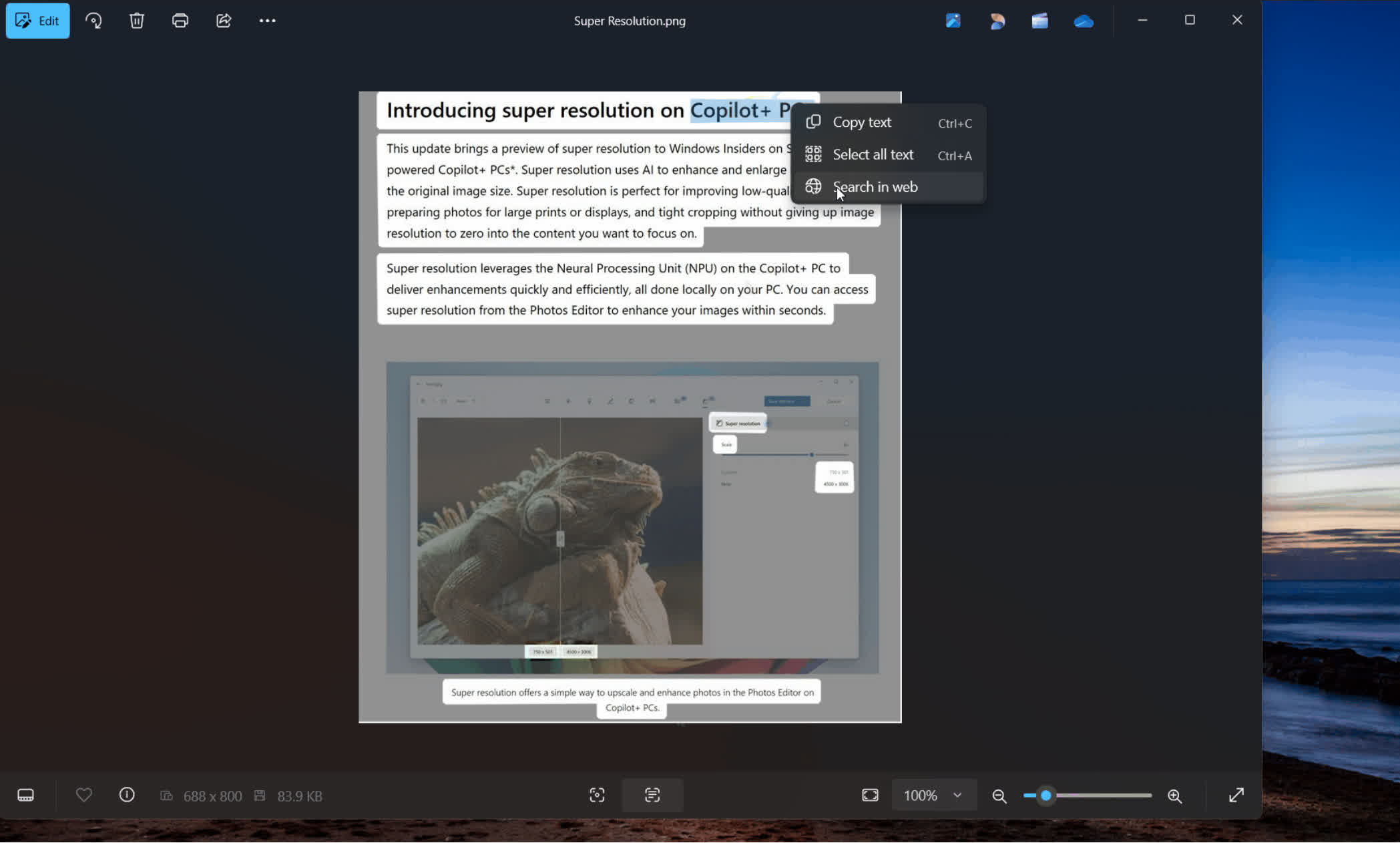 Să începem cu integrarea copilotului. Această nouă caracteristică apare ca un buton care oferă acces direct la un asistent AI conceput pentru lucrul cu imagini. Una dintre funcțiile sale cheie este sfaturile de editare a fotografiei, care oferă sugestii pentru a vă îmbunătăți fotografiile. De asemenea, oferă informații despre imagini, dezvăluind detalii interesante despre o anumită fotografie.
