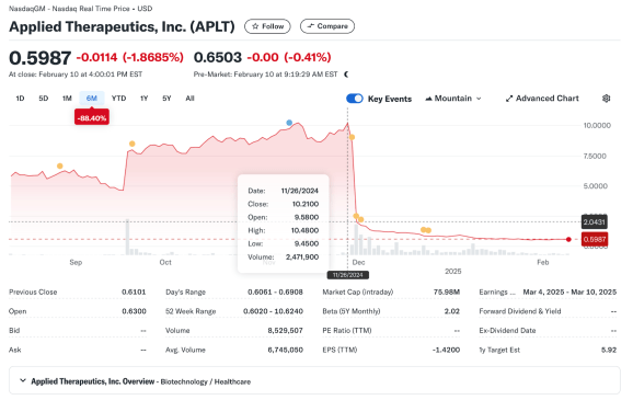 La sfârșitul lunii noiembrie 2024, stocul Applied Therapeutics (APLT) a scăzut după ce FDA a respins medicamentul cu boala metabolică. Și când spunem „PLUMMETED”, ne referim la asta – APLT a pierdut trei sferturi din evaluarea sa aproape instantaneu: