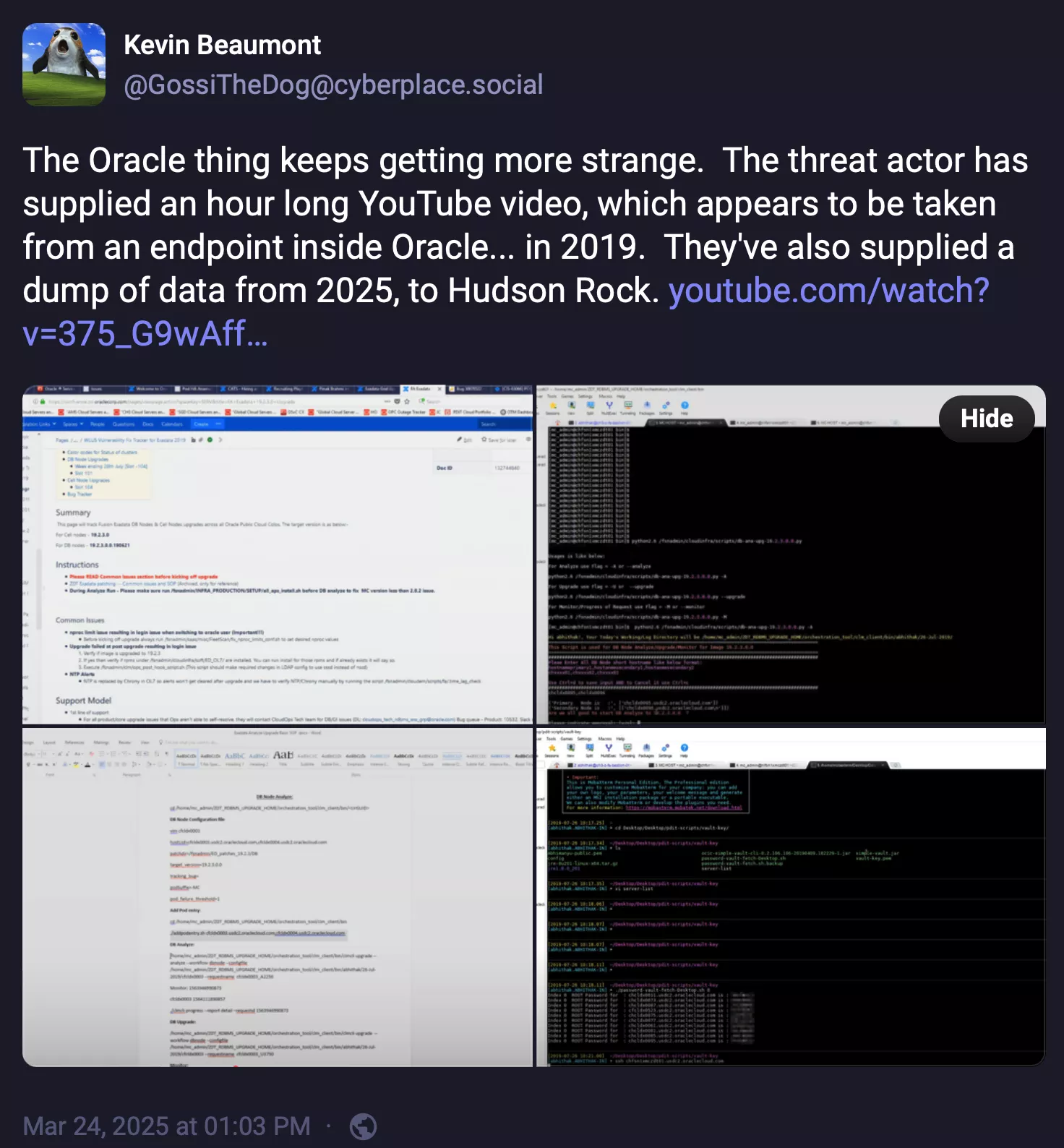 De asemenea, firma de securitate a confirmat că cache -ul a inclus informații de identificare personală, cum ar fi prenumele și prenumele, numele de afișare completă, adresele de e -mail, titlurile de locuri de muncă, numerele de departament, numerele de telefon, numerele de telefon mobil și chiar datele de contact la domiciliu. De asemenea, hackerul a încărcat o înregistrare a unei întâlniri interne Oracle.