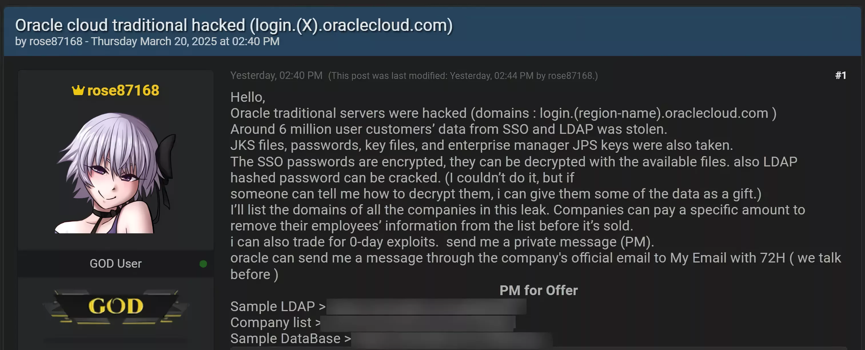 La începutul acestei luni, un actor de amenințare care trece cu Rose87168 a susținut că a încălcat serverele SSO federate ale Oracle Cloud și a exfiltrat în jur de 6 milioane de înregistrări, afectând peste 144.000 de clienți Oracle. Hackerul a furnizat o listă internă de clienți și a amenințat să vândă datele, cu excepția cazului în care clienții au plătit pentru a-și elimina datele din trove, care au inclus acreditări unice de conectare, parole de protocol de acces ușor de acces, taste OAuth2, date de chiriași și multe altele. Rose87168 a solicitat, de asemenea, ajutor din partea comunității de hacking pentru a sparge parola de hașă în comerț pentru unele dintre date.