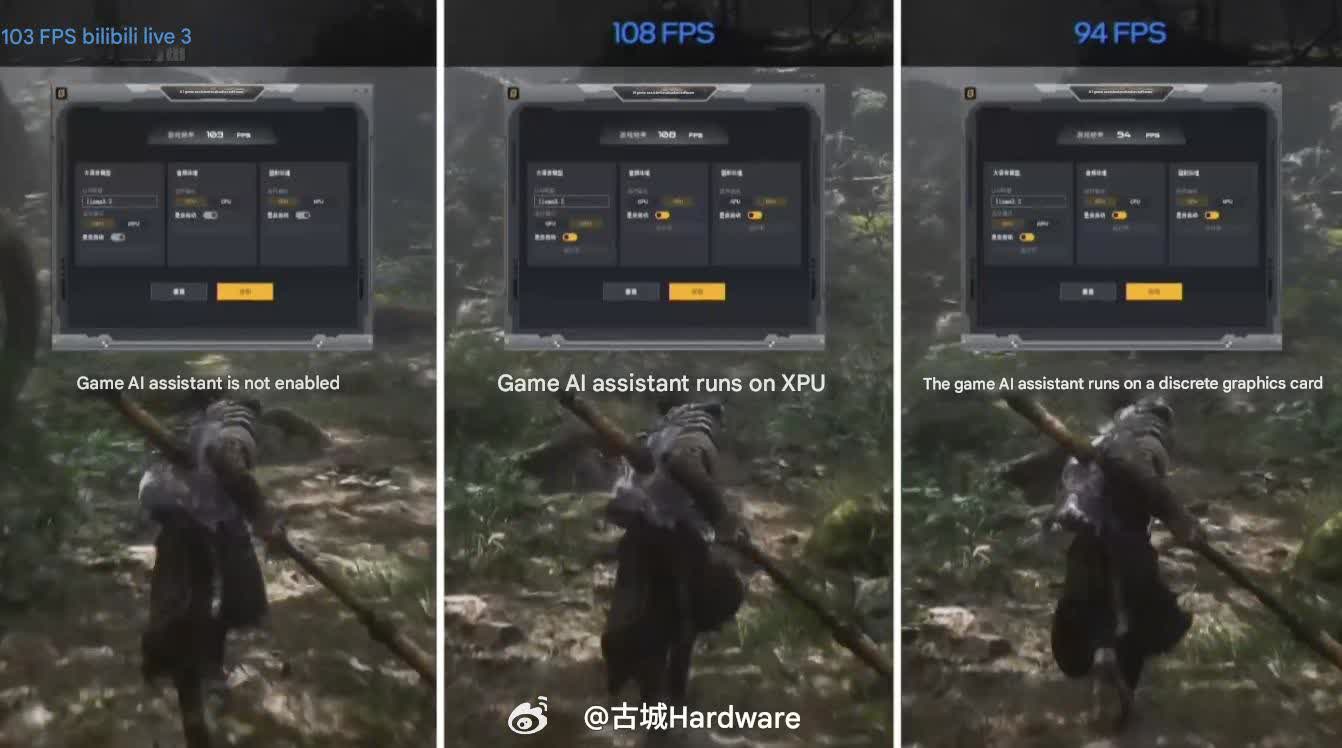 Prezentarea Intel a evidențiat, de asemenea, câștigurile potențiale de performanță de la rularea modelelor AI pe NPU. Activarea asistentului a sporit frameratul lui Wukong de la 103 la 108 fps, în timp ce rularea aceluiași model pe GPU a provocat o scădere la 94 fps.