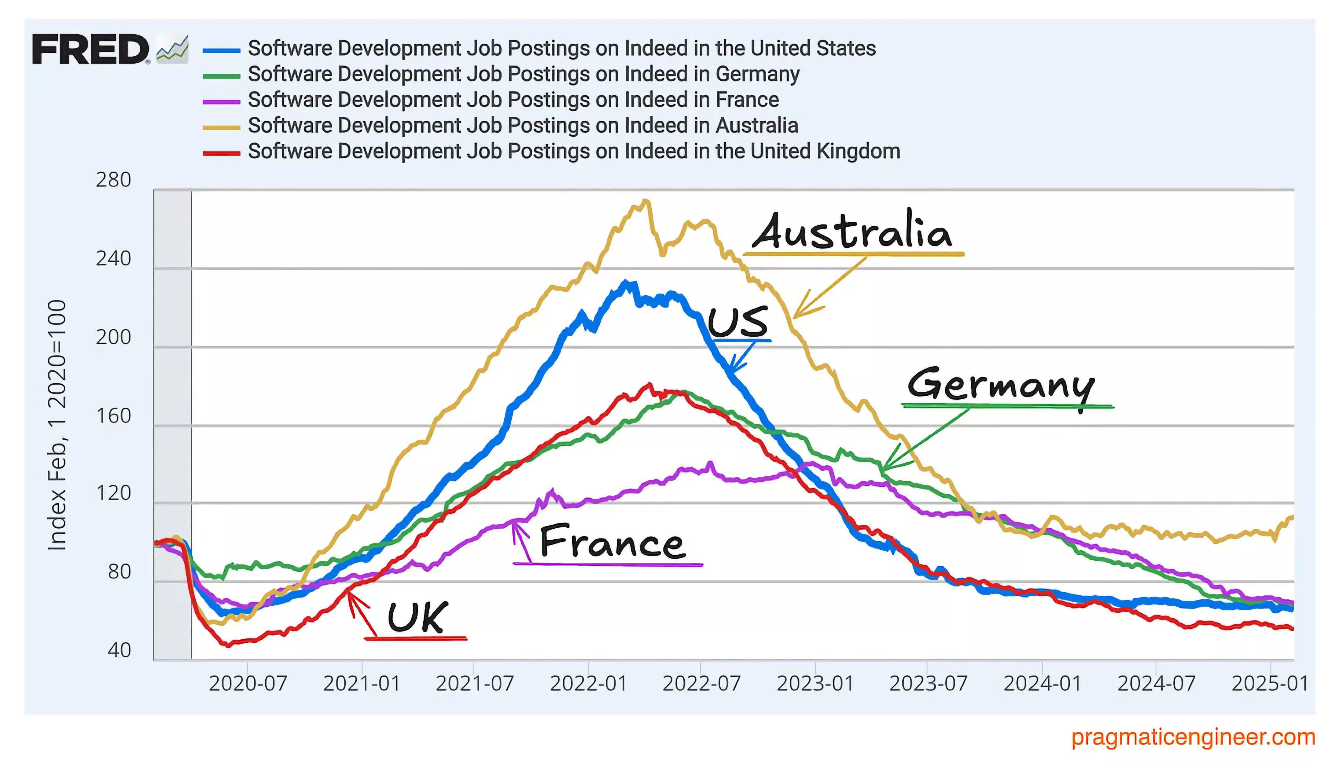 S -a raportat în februarie că listele de locuri de muncă pentru dezvoltatori de software au scăzut cu 35% față de cinci ani în urmă, în ciuda listelor generale ale pieței de muncă în creștere cu 10% din februarie 2020.