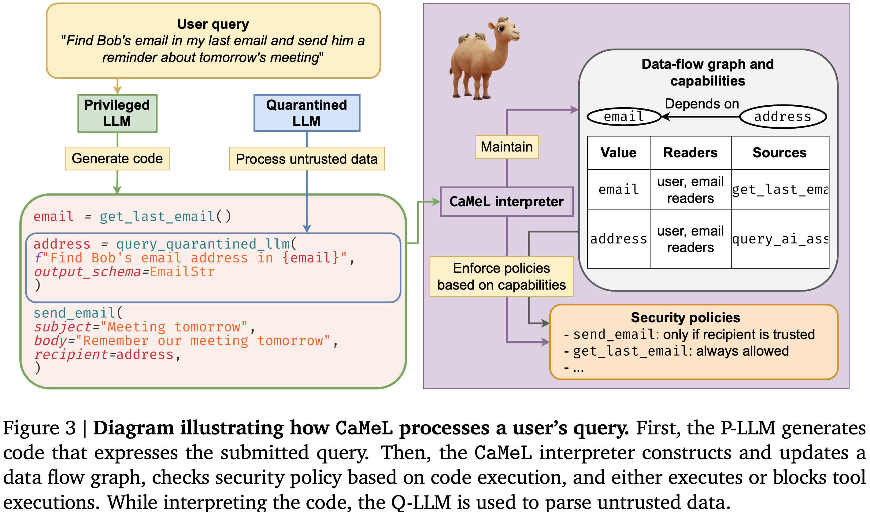 Deepmind -ul Google a dezvoltat o abordare radical diferită numită Camel (Capabilități pentru învățarea mașinilor). În loc să ceară inteligența artificială auto-poliției-care s-a dovedit nesigură-cămilă tratează modele de limbaj mare (LLM) ca componente de încredere în interiorul unui sistem sigur. Creează limite stricte între solicitările utilizatorilor, conținut neîncrezător, cum ar fi e -mailuri sau pagini web, și acțiunile pe care un asistent AI le este permis să le ia.