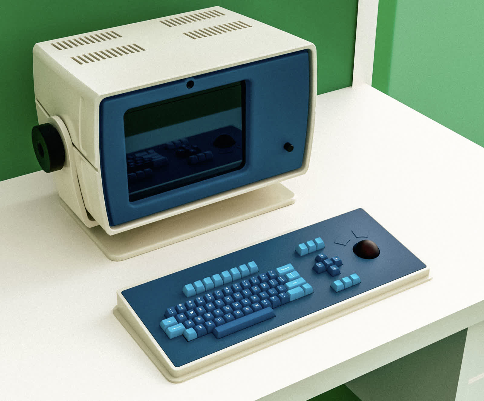 Tastatura are un profil ridicat, margini groase și o paletă de albastru mut, cu un cadru alb murdar, oferindu -i o atmosferă industrială. Chestele albastre mai deschise domină centrul, în timp ce nuanțele mai întunecate completează restul. Acea „odihnă” este substanțială, datorită punții supradimensionate, care lasă un spațiu suficient pentru tastele săgeată, aranjat într -o formațiune încrucișată și separat de clusterul primar. În extrema dreaptă se află un trackball – la fel ca în spectacol – înlocuind un mouse tradițional și adăugându -se la farmecul său vintage.