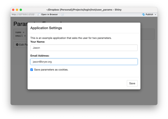 Modulul de parametri utilizator face parte din login Pachet R. Scopul este de a prezenta utilizatorului un set de parametri într -un dialog modal pe măsură ce aplicația strălucitoare se încarcă. Interfața principală este prin intermediul userParamServer() funcție care poate fi inclusă în codul serverului. Următorul este un exemplu de bază.