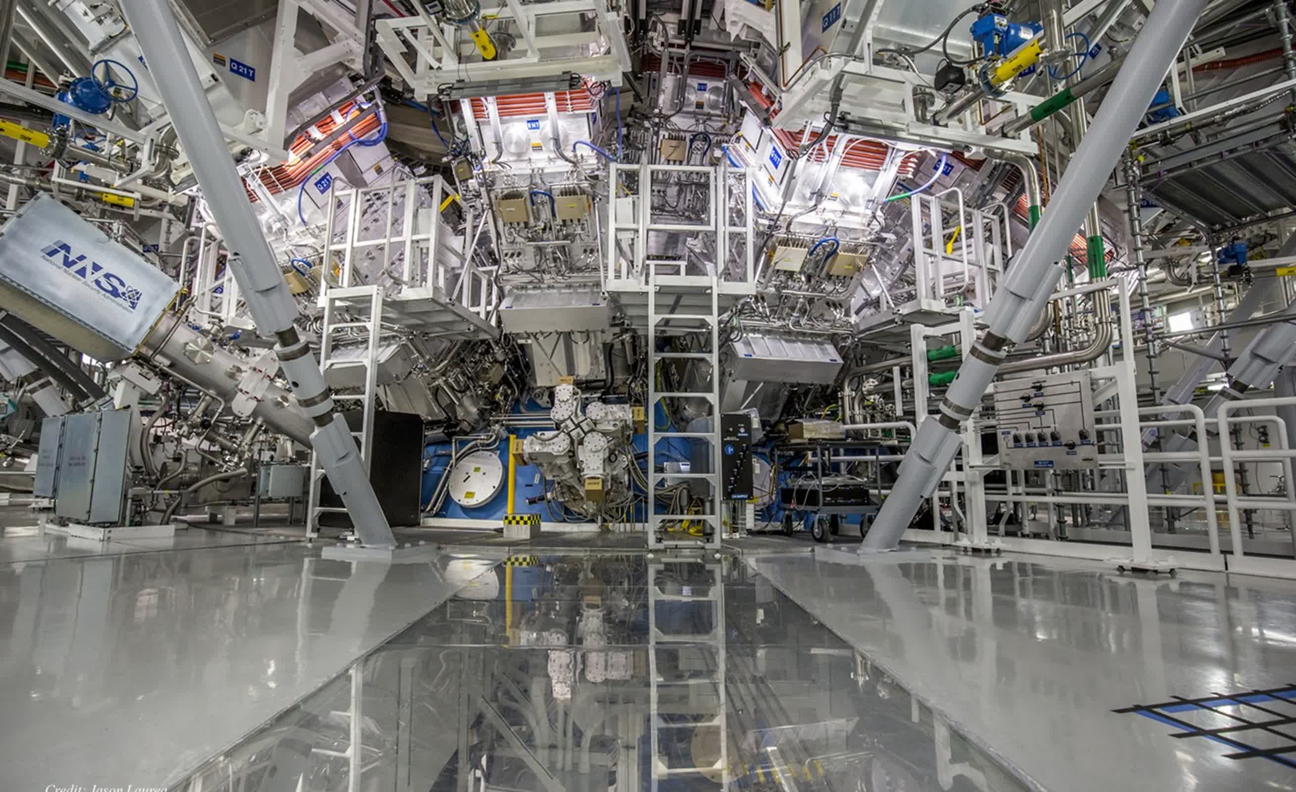 Peletul, nu mai mare decât un BB, este poziționat în centrul unei camere de vid sferice de 10 metri. Când începe experimentul, 192 lasere cu putere mare converg pe hohlraum, vaporizând-o și generând o explozie de raze X. Aceste raze X bombardează peletul de combustibil, ceea ce face ca coaja de diamant să devină o plasmă în expansiune rapidă.