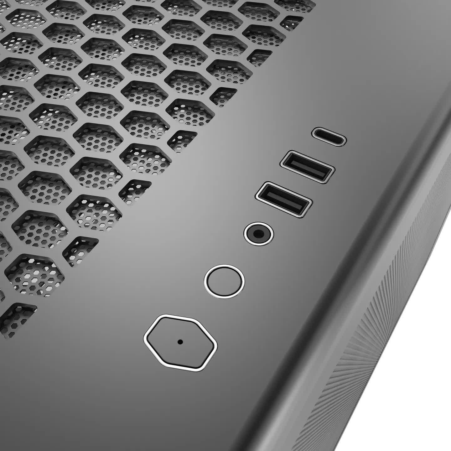Șasiul bugetar oferă un design fără instrumente și facilități moderne, cum ar fi USB 3.2 Gen 2×2 Type-C. De asemenea, obțineți spațiu pentru un HDD de 3,5 inci, două SSD de 2,5 inci și o altă unitate de 2,5 inci /3,5 inci. Proiectarea camerei duale elimină sursa de alimentare la vedere în spatele tavii plăcii de bază, care ajută foarte mult la gestionarea cablurilor. Fluxul de aer nu ar trebui să fie o preocupare, având în vedere că panoul lateral drept este complet perforat.