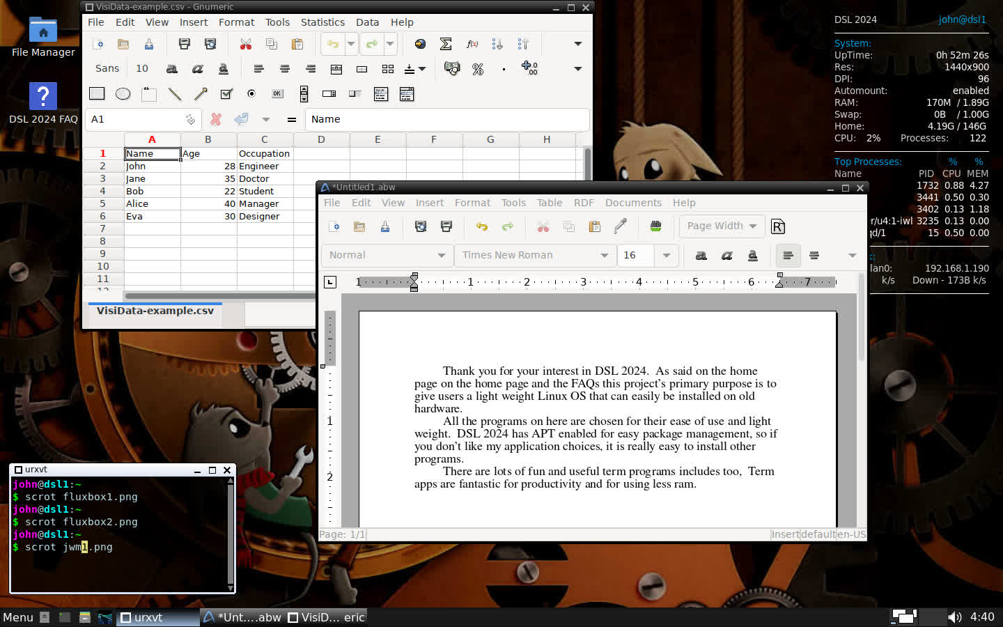 DSL 2024 se livrează în prezent doar cu doi manageri de ferestre: Fluxbox și JWM. Ambele sunt ușoare, destul de intuitive și ușor de utilizat.