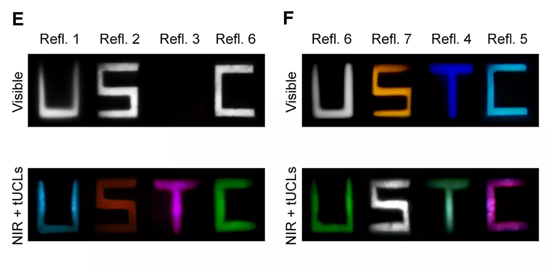 În imaginea de mai sus, lentilele schimbă modul în care literele apar sub lumină de infraroșu aproape (jos) în comparație cu lumina vizibilă (partea de sus), într-un caz, dezvăluind o scrisoare ascunsă anterior. Într-un alt experiment, oglinzile care au apărut monocromatice în lumina vizibilă au devenit mai colorate sub infraroșu aproape, în timp ce cele care prezintă culoare în nuanțe de lumină vizibilă schimbate sub NIR.