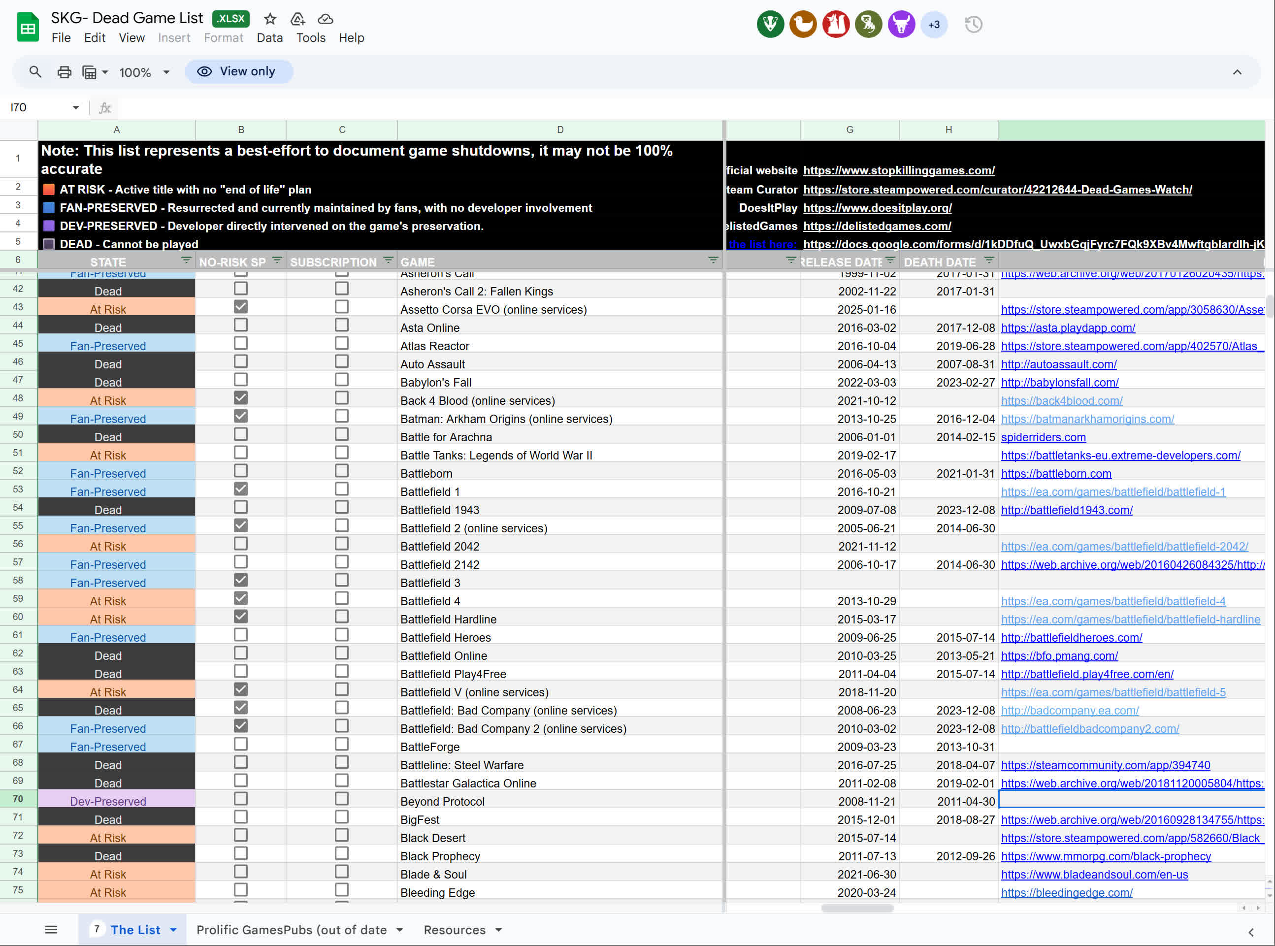 Lista de jocuri SKG Dead este o încercare de cel mai bun efort de a documenta titluri care au fost închise și, deși este posibil să nu fie 100 la sută cuprinzătoare, oferă o perspectivă valoroasă. Lista include jocuri care sunt deja offline, cele cu risc de a pierde funcții online și titluri care au fost păstrate de patch-uri făcute de fani sau dezvoltatori proactivi.