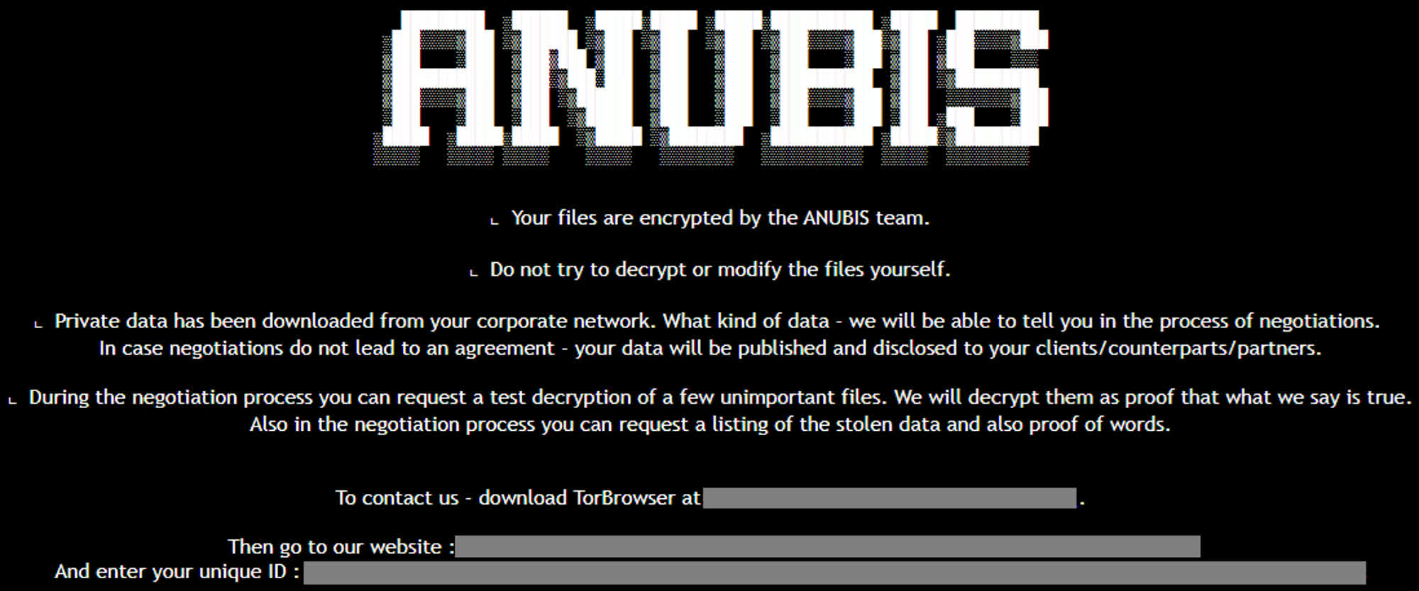 Anubis a fost identificat pentru prima dată în decembrie 2024, când trend Micro a analizat un eșantion de lucru în curs de desfășurare cunoscut sub numele de Sfinx. Potrivit firmei de securitate, Anubis și Sfinx sunt în esență același malware, diferind în principal în nota de răscumpărare scăzută pe sistemele infectate. Pagina de extorsiune a lui Anubis de pe Web Dark listează în prezent doar opt victime, ceea ce sugerează că dezvoltatorii ar putea să crească partea de afaceri a operațiunii, odată ce aspectele tehnice sunt complet dezvoltate.