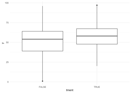 treated <- sim_data(mean = 60) smp <- bind_rows( baseline %>% mutate(tment = FALSE) %>% select(tment, y), treated %>% mutate(tment = TRUE) %>% select(tment, y) ) ggplot(smp, aes(x = tment, y = y)) + geom_boxplot() + theme_minimal()