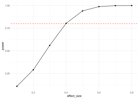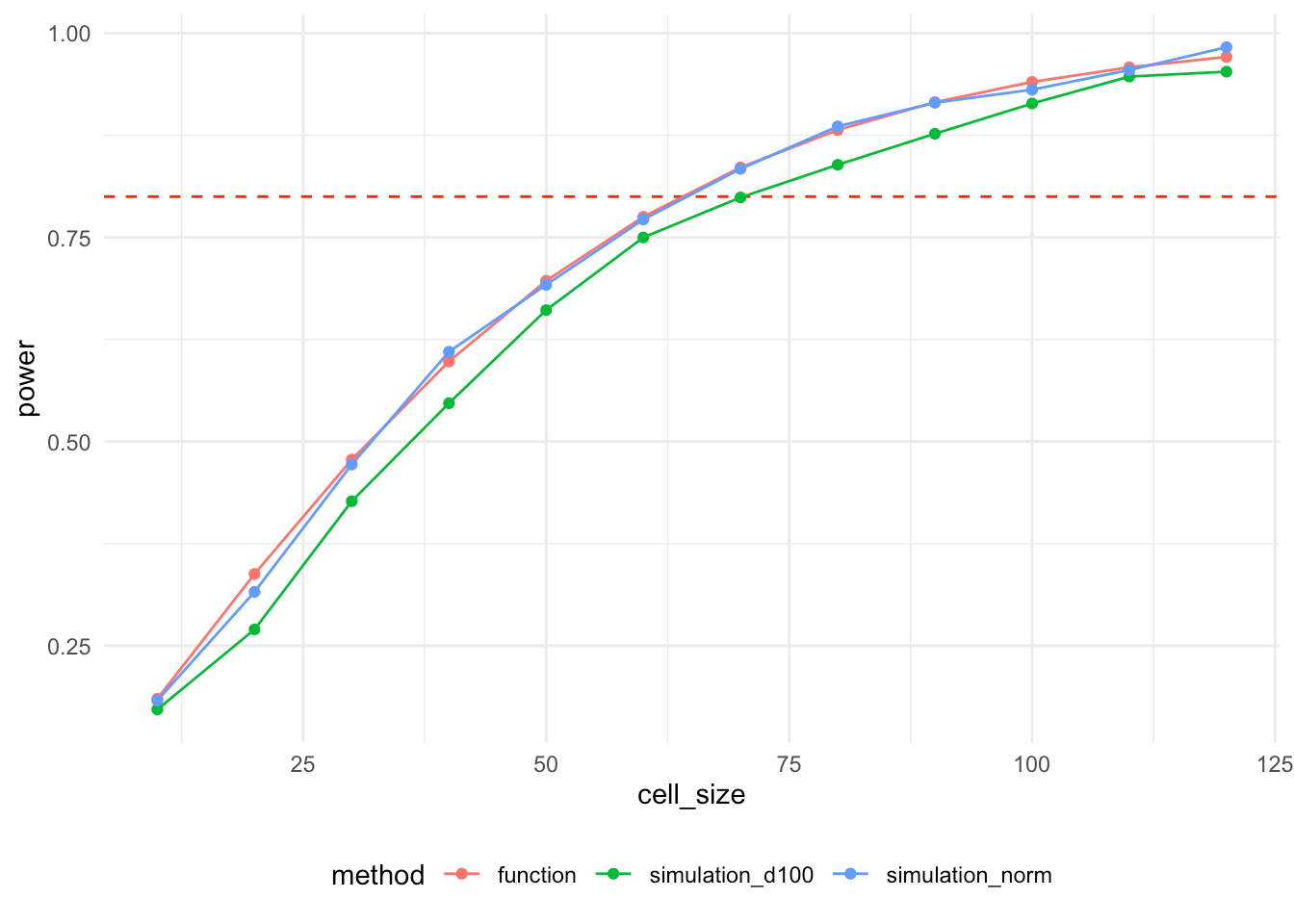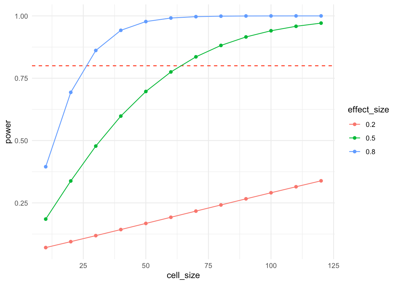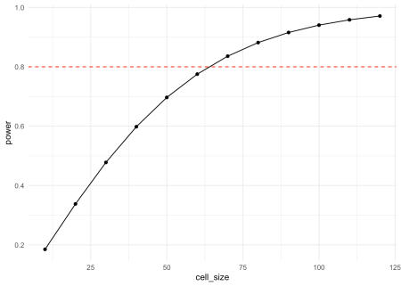 df <- bind_rows( lapply(seq(10, 120, by = 10), function(x) my_power_fct(cell_size = x)) ) ggplot(df, aes(x = cell_size, y = power)) + geom_hline(yintercept = 0.8, lty = 2, color = "red") + geom_line() + geom_point() + theme_minimal()