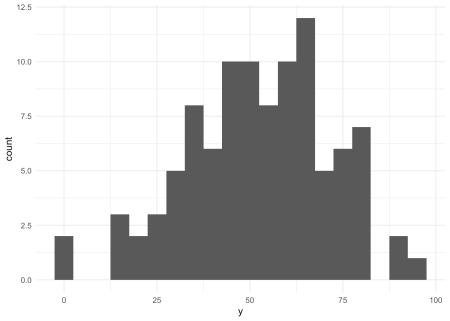ggplot(baseline, aes(x = y)) + geom_histogram(bins = 20) + theme_minimal()