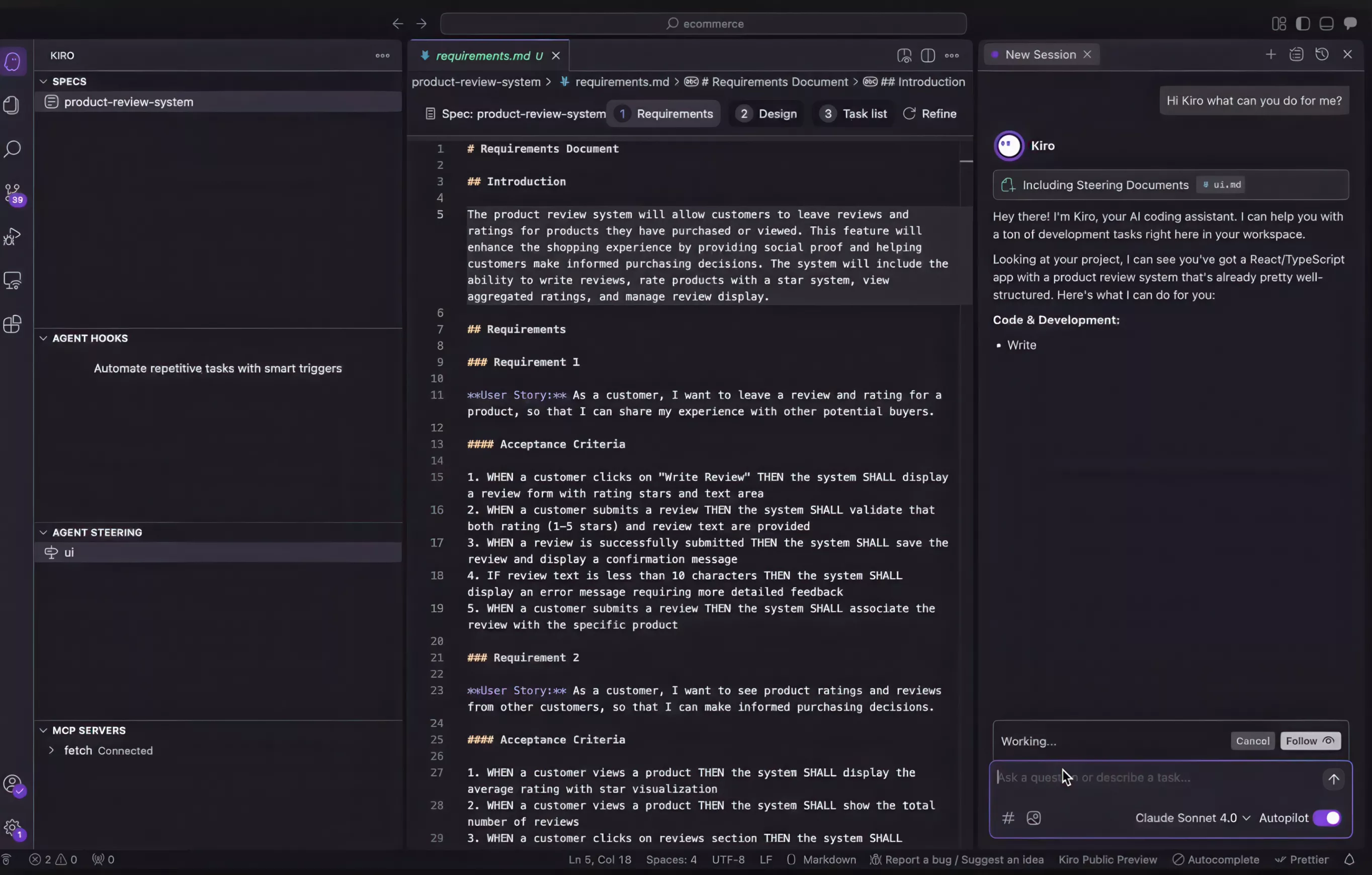 Specificațiile Kiro sunt artefacte care se dovedesc utile oricând trebuie să vă gândiți printr-o caracteristică în profunzime, o muncă de refactor care are nevoie de o planificare în avans sau atunci când doriți să înțelegeți comportamentul sistemelor în scurt, majoritatea lucrurilor de care aveți nevoie pentru a ajunge la producție. Cerințele sunt de obicei incerte atunci când începeți să construiți, motiv pentru care dezvoltatorii folosesc specificații pentru planificare și claritate. Specificațiile pot ghida agenții AI către o implementare mai bună în același mod.