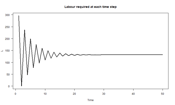 La început (la timp t=2 Deoarece R indexuri R care încep de la 1) toată lumea este concediată din cauza faptului că este înlocuit de AI. Dar, din moment ce performanța AI se degradează de -a lungul timpului, unii oameni trebuie să fie angajați înapoi, apoi trași din nou, apoi … până la urmă, se ajunge la un echilibru în care este necesară o muncă mai mică umană, dar ciclurile de angajare și de tragere nu se mai întâmplă.