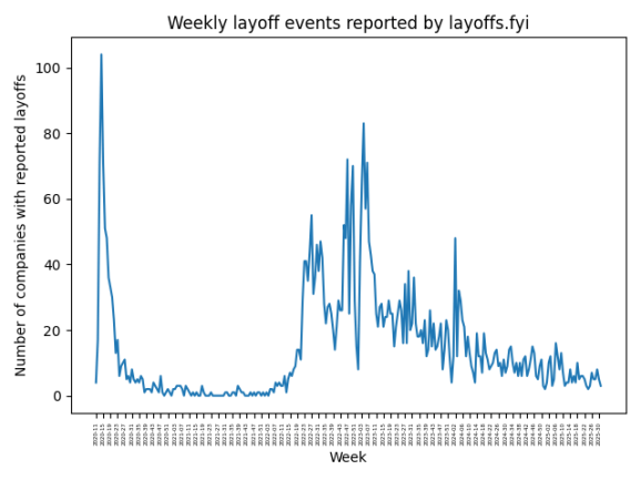 Am studiat anterior concedieri tehnologice. Conform principalului meu sursă de concedieri de date.FYI, numărul săptămânal de concedieri a scăzut constant. În SUA, acest lucru a fost compensat de un număr imens de concedieri în sectorul guvernamental, dar totuși, tendința pentru lucrătorii din tehnologie pare a fi bună. Cu toate acestea, numărul disponibilizărilor rămâne semnificativ mai mare decât scăzutul său în 2022, ceea ce înseamnă că lucrătorii tehnologici au mai puțină securitate a locurilor de muncă decât înainte.