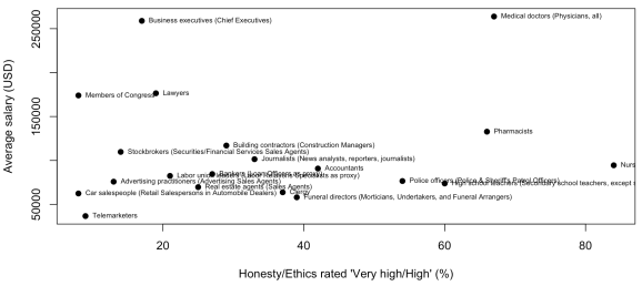 S -ar putea să ne întrebăm dacă există o corelație între etică și salariu. Folosind Biroul SUA al Statisticilor Muncii din SUA (BLS) datele naționale de muncă în muncă și estimări ale salariilor, s -ar putea obține cu ușurință salariul mediu în SUA pentru unele profesii. Pentru ceilalți, unul trebuie să sap ceva mai mult