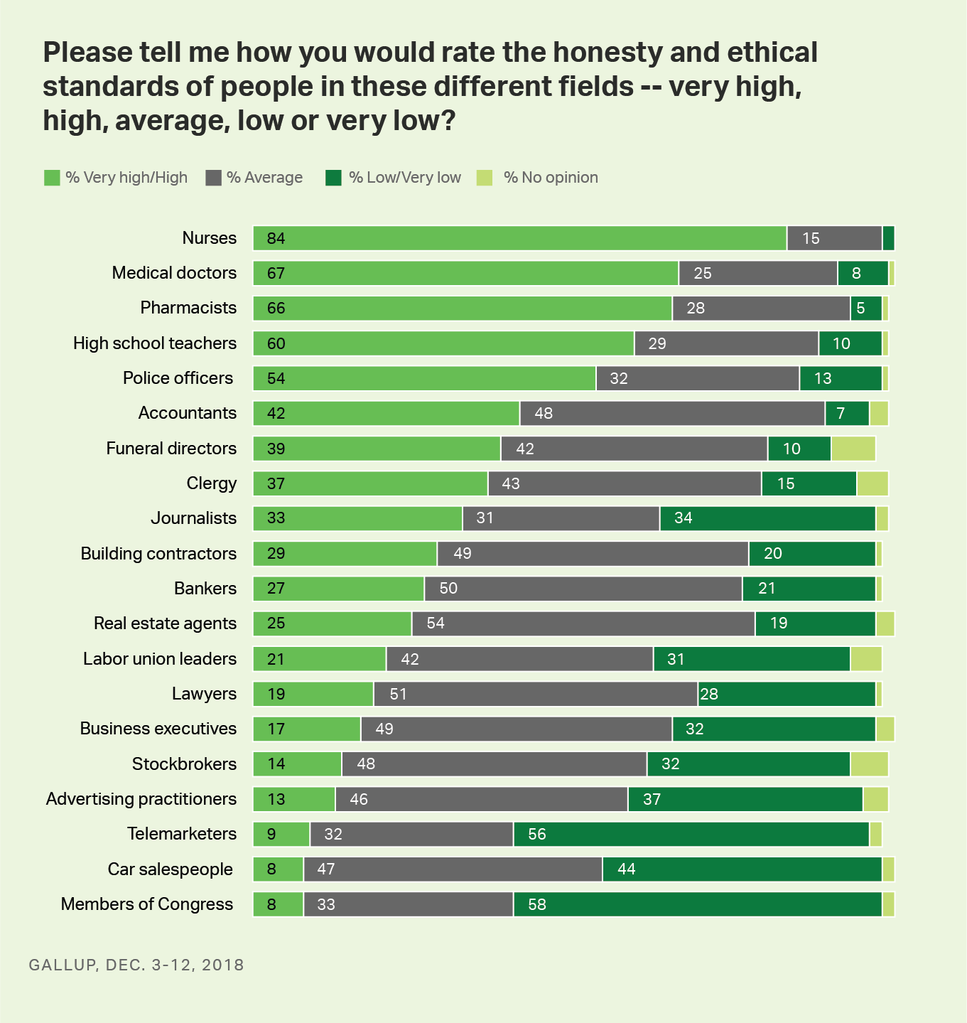 Mai mult de patru din cinci americani (84%) evaluează din nou onestitatea și standardele etice ale asistenților medicali drept „foarte mari” sau „mari”, câștigându -le primul loc printre o listă diversă de profesii pentru cei 17Th an consecutiv. În același timp, membrii Congresului sunt din nou ținuți în cea mai mică stimă, deoarece aproape 58% dintre americani spun că au standarde etice „scăzute” sau „foarte mici”. Telemarketers se alătură membrilor Congresului ca având o majoritate de ratinguri mici/foarte mici.