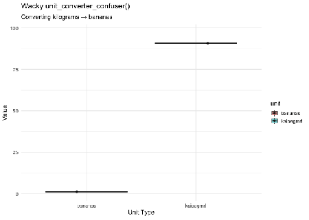 set.seed(2908) fake_weights <- rnorm(20, mean = 70, sd = 15) unit_converter_confuser(fake_weights, unit_from = "kilograms", chaos = 0.92)
